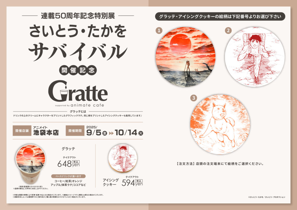 『サバイバル』 50周年特別展を記念し、アニメイト「グラッテ」と『サバイバル』のコラボレーション商品として「グラッテ」メニューのアイシングクッキーとドリンクをアニメイト池袋本店にて販売しております。