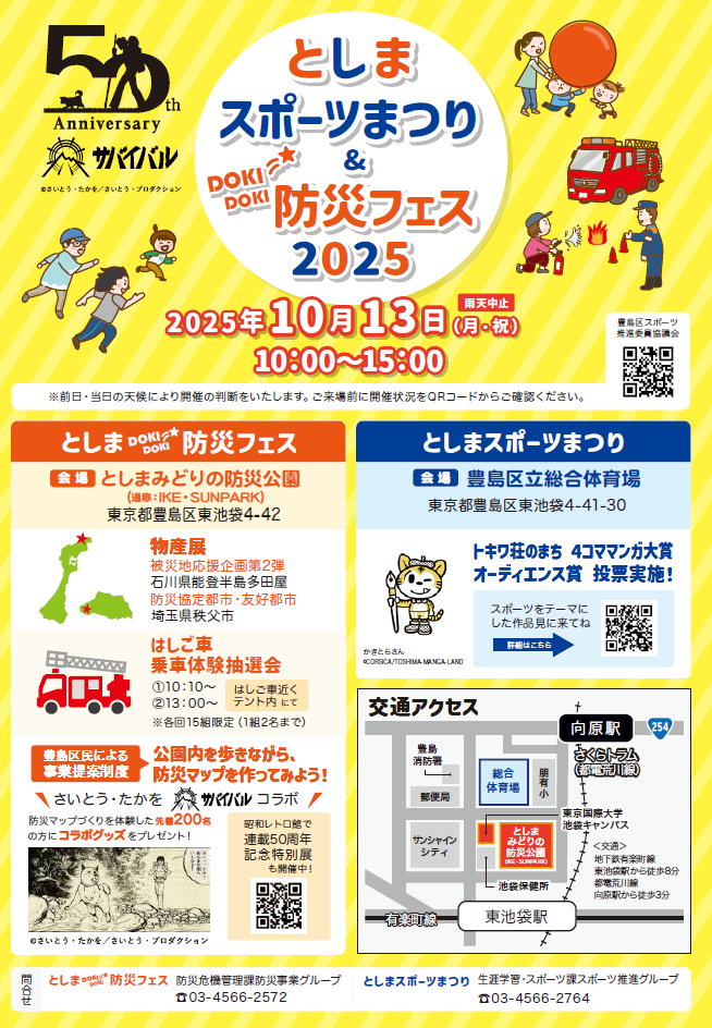 2025年10月、毎年実施されている子どもから大人まで楽しんで防災を学べる豊島区のイベント「としまDOKI☆彡DOKI防災フェス」が開催されました。イベントでは豊島区民による令和6年度事業提案制度で採択された「歩いて作る防災マップづくり」を実施。マップ作りを体験した先着200名の方に、災害時にも使えるさいとう・たかを『サバイバル』仕様の「組み立て式紙製食器」がプレゼントされました。