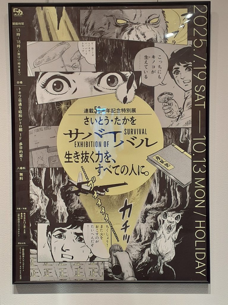 トキワ荘通り昭和レトロ館(東京都豊島区)にて10月13日(月・祝)まで開催中の【連載50周年記念特別展「さいとう・たかを サバイバル」 生き抜く力を、すべての人に。】の公式ポスターです。